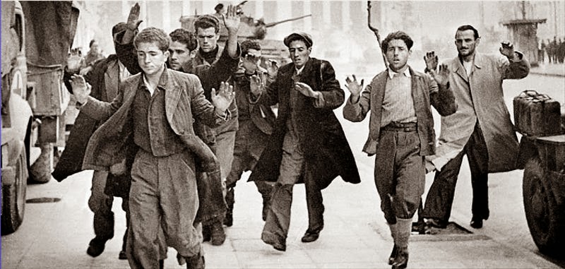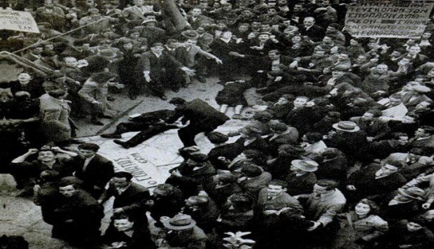 Ευκαιρία να εξασκήσωτα τα αγγλικά μου «God save the Queen». Από την Βουλγαροκτόνου ίσαμε την Αλεξάνδρας ακούγονται ριπές θριάμβου. Στις φυλακές Αβέρωφ πρόσωπα χέρια χωνιά σιδερόφραχτα φωνάζουν. Τι άραγε; Μέχρι το Σύνταγμα οι παρέες πληθαίνουν κι ο φόβος μικραίνει κι ο αέρας γεμίζει κραυγές «Όχι άλλη Κατοχή». Στις αφύλακτες διαβάσεις οδοφράγματα στήνονται κι από τις εφημερίδες δυσοσμία απλώνεται. Στο μεγάλο ξενοδοχείο της γωνίας μια δράκα πολιτικών συγχαίρουν τους κλεπταποδόχους της Ιστορίας.